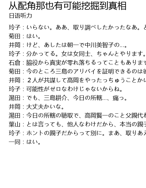 | 玲子:いらない。ああ、取り調べしたかったなあ。どう考えても、事件の一番近くにいるのは三島耕介なんだから。こうなったら、高岡賢一のことがっつり調べるわよ。 菊田:はい。 井岡:けど、あしたは朝一で中川美智子の…。 玲子:分かってる。女は女同士、ちゃんとやります。 石倉:脇役から真実が零れ落ちるってこともありますからね。 菊田:今のところ三島のアリバイを証明できるのは彼女だけですし。 井岡:2人が共謀して高岡をやったっちゅうことかいな。 玲子:可能性がゼロなわけじゃないからね。 湯田:でも、三島耕介、今日の所轄…、痛っ。 井岡:大丈夫かいな。 湯田:今日の所轄の聴取で、高岡賢一のこと父親代わりって言ってたんですよね? 葉山:とは言っても、他人なわけだから、本当の親子みたいにはいかないだろう。 玲子:ホントの親子だからって別に。まあ、取りあえず、みんなは三島と高岡の関係を徹底的に洗って。私は高岡の過去から当たってみる。 一同:はい。 |