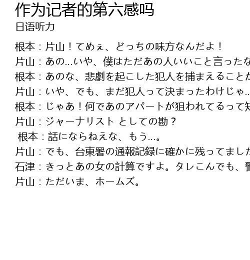 | 根本:片山!てめぇ、どっちの味方なんだよ! 片山:あの…いや、僕はただあの人いいこと言ったなぁと思って…。 根本:あのな、悲劇を起こした犯人を捕まえることが警察の仕事なんだよ!それを何だ?お前。今一番犯人っぽい奴に肩入れして、気さくに「令子さん」なんて呼びやがって! 片山:いや、でも、まだ犯人って決まったわけじゃ…。 根本:じゃあ!何であのアパートが狙われてるって知ってんだよ!? 片山:ジャーナリスト としての勘? | |