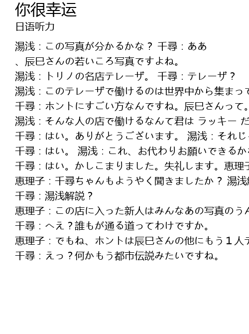 | 湯浅:この写真が分かるかな? 千尋:ああ 、辰巳さんの若いころ写真ですよね。 湯浅:トリノの名店テレーザ。 千尋:テレーザ? 湯浅:このテレーザで働けるのは世界中から集まってくる料理人の中でもほんの一握りの精鋭のみ。この店に入ることができた日本人は辰巳さんだけなんだよ。 千尋:ホントにすごい方なんですね。辰巳さんって。 湯浅:そんな人の店で働けるなんて君は ラッキー だね 。 千尋:はい。ありがとうございます。 湯浅:それじゃ…。 千尋:はい。 湯浅:これ、お代わりお願いできるかな。 千尋:はい。かしこまりました。失礼します。恵理子さん知ってました?テレーザの写真のこと。 恵理子:千尋ちゃんもようやく聞きましたか? 湯浅解説。 千尋:湯浅解説? 恵理子:この店に入った新人はみんなあの写真のうんちくを湯浅さんに教えてもらってんの。 千尋:へえ?誰もが通る道ってわけですか。 恵理子:でもね、ホントは辰巳さんの他にもう1人テレーザで修業した日本人がいるって噂もあるのよね。 千尋:えっ?何かもう都市伝説みたいですね。 |