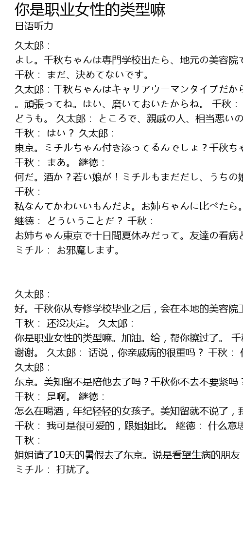 | jiǔ tài láng: hǎo. qiān qiū nǐ cóng zhuān xiū xué xiào bì yè zhī hòu, huì zài běn dì de měi róng yuàn gōng zuò ma? qiān qiū: hái méi jué dìng. jiǔ tài láng: nǐ shì zhí yè nǚ xìng de lèi xíng ma. jiā yóu. gěi, bāng nǐ cā guò le. qiān qiū: xiè xiè. jiǔ tài láng: huà shuō, nǐ qīn qī bìng de hěn zhòng ma? qiān qiū: shén me? jiǔ tài láng: dōng jīng. měi zhī liú bú shì péi tā qù le ma? qiān qiū nǐ bù qù bú yào jǐn ma? yào péi 10 tiān, zhēn ràng rén dān xīn a. qiān qiū: shì a. jì dé: zěn me zài hē jiǔ, nián jì qīng qīng de nǚ hái zi. měi zhī liú jiù bù shuō le, wǒ men jiā de nǚ ér dōu zěn me le?! qiān qiū: wǒ kě shì hěn kě ài de, gēn jiě jie bǐ. jì dé: shén me yì sī? qiān qiū: jiě jie qǐng le 10 tiān de shǔ jià qù le dōng jīng. shuō shì kàn wàng shēng bìng de péng yǒu, shéi zhī dào ne. : dǎ rǎo le. |