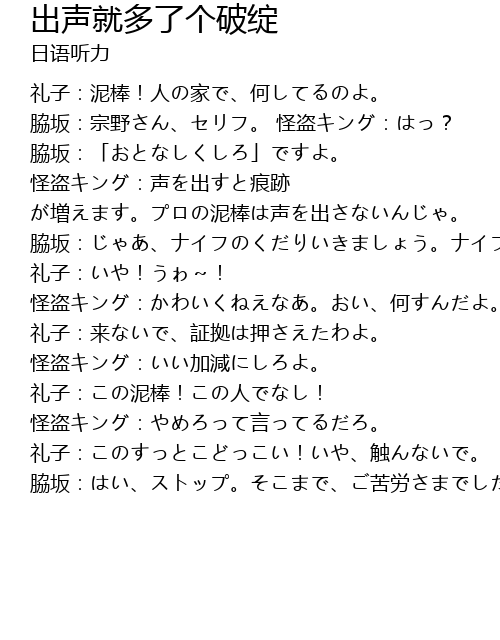 | 礼子:泥棒!人の家で、何してるのよ。 脇坂:宗野さん、セリフ。 怪盗キング:はっ? 脇坂:「おとなしくしろ」ですよ。 怪盗キング:声を出すと痕跡 が増えます。プロの泥棒は声を出さないんじゃ。 脇坂:じゃあ、ナイフのくだりいきましょう。ナイフ出して。早く。緊張感持って。 礼子:いや!うゎ~! 怪盗キング:かわいくねえなあ。おい、何すんだよ。 礼子:来ないで、証拠は押さえたわよ。 怪盗キング:いい加減にしろよ。 礼子:この泥棒!この人でなし! 怪盗キング:やめろって言ってるだろ。 礼子:このすっとこどっこい!いや、触んないで。 脇坂:はい、ストップ。そこまで、ご苦労さまでした。 |