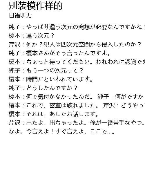 | 純子:やっばり違う次元の発想が必要なんですかね? 榎本:違う次元? 芹沢:何か?犯人は四次元空間から侵入したのか? 純子:榎本さんがそう言ったんですよ。 榎本:ちょっと待ってください。われわれに認識できるもう一つの次元が存在します。 純子:もう一つの次元って? 榎本:時間だといわれています。 純子:どうしたんですか? 榎本:何で気付かなかったんだ。 純子:何がですか? 榎本:これで、密室は破れました。 芹沢:どうやって? 榎本:それは、あしたお話します。 芹沢:出たよ。出ちゃったよ。俺が一番苦手なやつ。何であしたなんだよ。もったいぶる なよ。今言えよ!すぐ言えよ、ここで…。 |