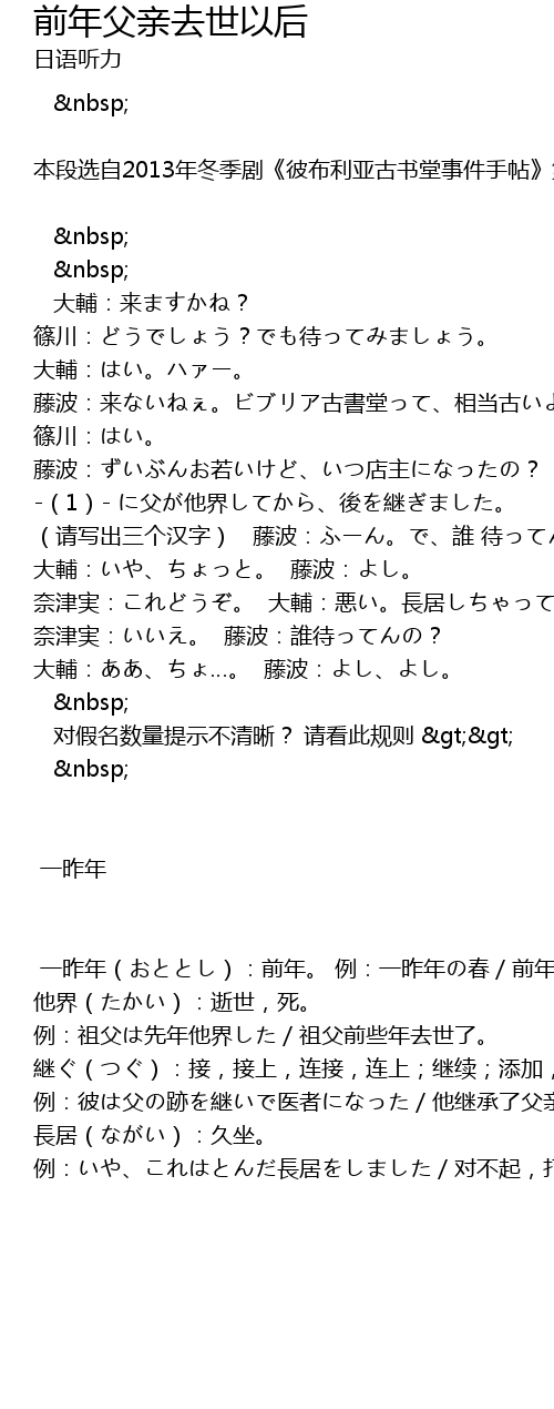 | 一昨年(おととし):前年。 例:一昨年の春/前年春天。 他界(たかい):逝世,死。 例:祖父は先年他界した/祖父前些年去世了。 継ぐ(つぐ):接,接上,连接,连上;继续;添加,续上;继承。 例:彼は父の跡を継いで医者になった/他继承了父亲成为医生。 長居(ながい):久坐。 例:いや、これはとんだ長居をしました/对不起,打搅得太久了。 | |