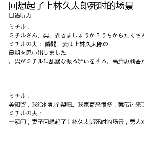 | ミチル: ミチルさん、梨、剥きましょうか?うちからたくさん送ってきたので、持ってきたんです。 ミチルの夫: 瞬間、妻は上林久太郎の 最期を思い出しました 。男がミチルに乱暴な振る舞いをする。高倉恵利香がミチルを守ろうとナイフで男を襲う。そんな先走った想像にミチルは身震いしました。 | |