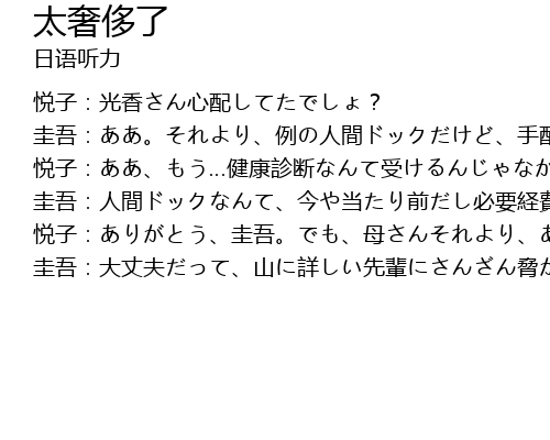 | 悦子:光香さん心配してたでしょ? 圭吾:ああ。それより、例の人間ドックだけど、手配しておいたから忘れずに行ってね。 悦子:ああ、もう…健康診断なんて受けるんじゃなかった。ちょっと血圧が高かったからって心配しすぎよ。だって、ねえ…。人間ドックって結構お金かかるんでしょ?贅沢よ。 圭吾:人間ドックなんて、今や当たり前だし必要経費だよ。金がなくて納得のいく治療を受けられずに親父が死んで悔しい思いしたんだ。母さんの健康のためなら。 悦子:ありがとう、圭吾。でも、母さんそれより、あなたの山登りの方が心配だわ。 圭吾:大丈夫だって、山に詳しい先輩にさんざん脅かされたけど、俺まだ29だぜ、体力には自信あるから。 |