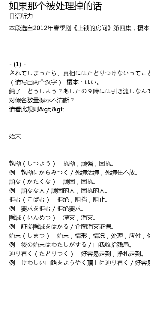 | 執拗(しつよう):执拗,顽强,固执。 例:執拗にからみつく/死缠活缠;死缠住不放。 頑な(かたくな):顽固,固执。 例:頑なな人/顽固的人;固执的人。 拒む(こばむ):拒绝,阻挡,阻止。 例:要求を拒む/拒绝要求。 隠滅(いんめつ):湮灭,消灭。 例:証拠隠滅をはかる/企图消灭证据。 始末(しまつ):始末;情形,情况;处理,应付;俭省,节约。 例:後の始末はわたしがする/由我收拾残局。 辿り着く(たどりつく):好容易走到,挣扎走到。 例:けわしい山路をようやく頂上に辿り着く/好容易才沿着危险的山路走到了山顶。 |
