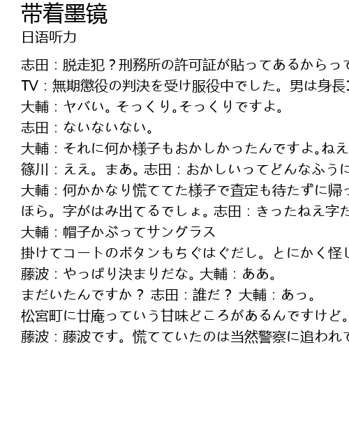 | 志田:脱走犯?刑務所の許可証が貼ってあるからってそりゃ飛躍し過ぎだろ。 TV:無期懲役の判決を受け服役中でした。男は身長175cmの中肉中背で。 大輔:ヤバい。 そっくり。そっくりですよ。 志田:ないないない。 大輔:それに何か様子もおかしかったんですよ。ねえ? 篠川:ええ。まあ。 志田:おかしいってどんなふうに。 大輔:何かかなり慌ててた様子で査定も待たずに帰っちゃって。あと買い取り表も。 ほら。字がはみ出てるでしょ。 志田:きったねえ字だな。 大輔:帽子かぶってサングラス 掛けてコートのボタンもちぐはぐだし。とにかく怪しさ満点だったんですよ。 藤波:やっぱり決まりだな。 大輔:ああ。 まだいたんですか? 志田:誰だ? 大輔:あっ。 松宮町に廿庵っていう甘味どころがあるんですけど。そこのマスターです。 藤波:藤波です。慌てていたのは当然警察に追われていたからだ。 |