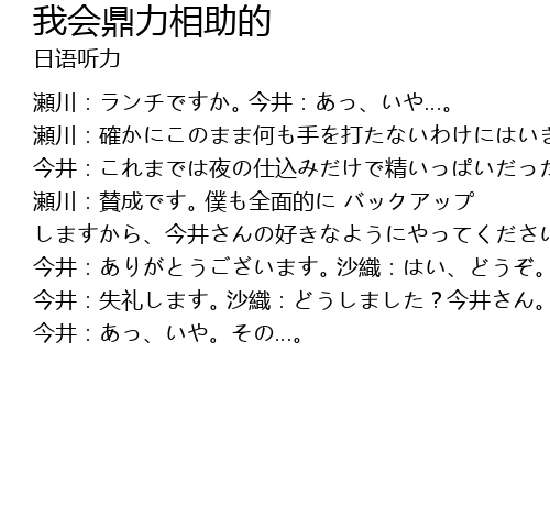 | 瀬川:ランチですか。 今井:あっ、いや…。 瀬川:確かにこのまま何も手を打たないわけにはいきませんものね。 今井:これまでは夜の仕込みだけで精いっぱいだったんですが、今ならランチもやれると思いまして。 瀬川:賛成です。 僕も全面的に バックアップ しますから、今井さんの好きなようにやってください。 今井:ありがとうございます。 沙織:はい、どうぞ。 今井:失礼します。 沙織:どうしました?今井さん。 今井:あっ、いや。その…。 |