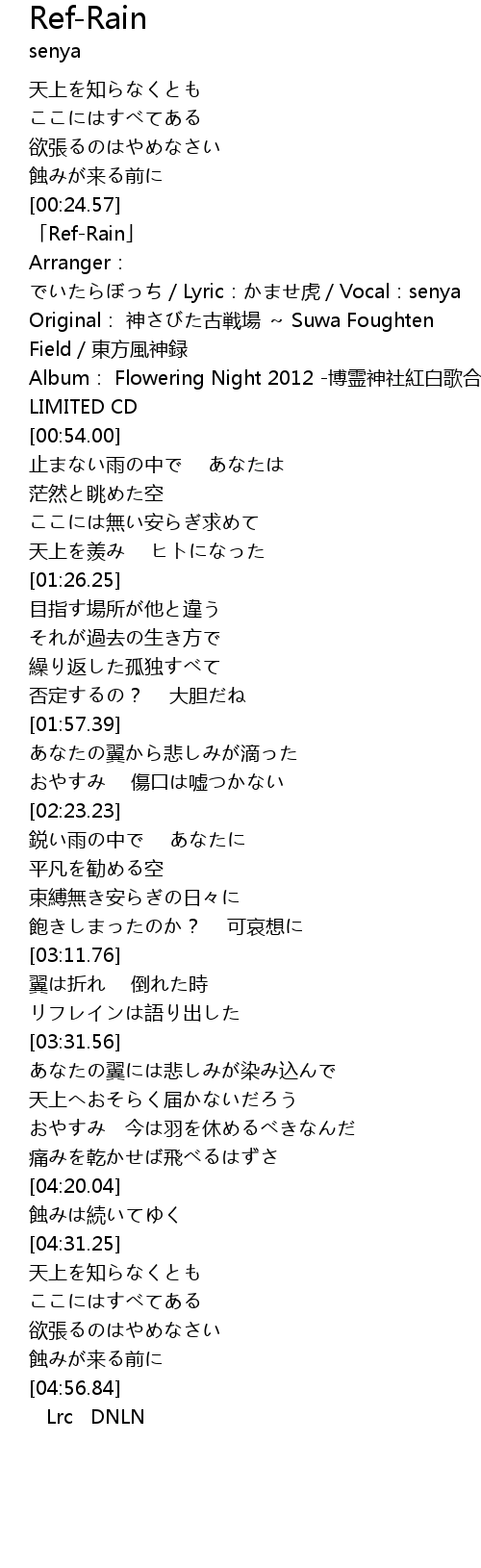 | [00:36.00] | Arranger: でいたらぼっち/Lyric:かませ虎/Vocal:senya |
