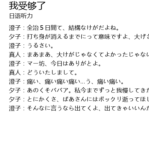 | 澄子:全治5日間て、結構なけがだよね。 夕子:打ち身が消えるまでにって意味ですよ、大げさな。 澄子:うるさい。 真人:まあまあ、大けがじゃなくてよかったじゃないですか。 澄子:マー坊、今日はありがとよ。 真人:どういたしまして。 澄子:痛い、痛い痛い痛い…う、痛い痛い。 夕子:あのくそババア。私今までずっと我慢してきたんだから。仕事は任せてくれないし、私のやることなすこと全部にケチつけて文句ばっかり。あー、もううんざり真人:まあまあ、夕子さん。 夕子:とにかくさ、ばあさんにはポックリ逝ってほしいよ。 澄子:そんなに言うなら出てくよ、出てきゃいいんだろ! |