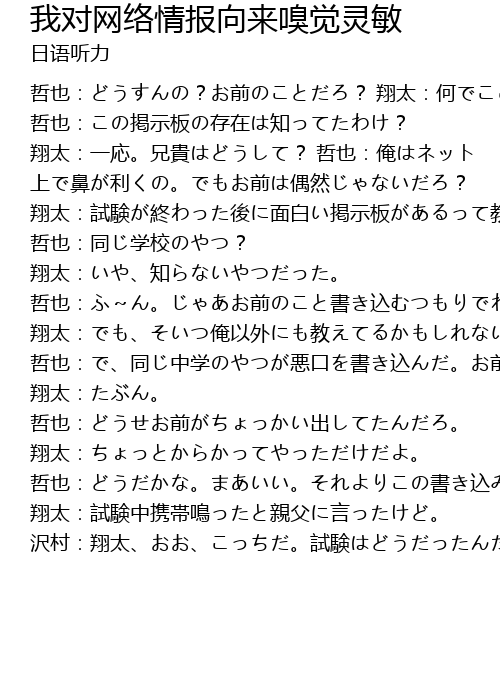 | 哲也:どうすんの?お前のことだろ? 翔太:何でここに。 哲也:この掲示板の存在は知ってたわけ? 翔太:一応。兄貴はどうして? 哲也:俺はネット 上で鼻が利くの。でもお前は偶然じゃないだろ? 翔太:試験が終わった後に面白い掲示板があるって教えてくれたやつがいたんだ。携帯ですぐに見たけどそのときは俺のことなんか書いてなかったし。 哲也:同じ学校のやつ? 翔太:いや、知らないやつだった。 哲也:ふ~ん。じゃあお前のこと書き込むつもりでわざと教えたわけじゃなさそうだな。 翔太:でも、そいつ俺以外にも教えてるかもしれない。 哲也:で、同じ中学のやつが悪口を書き込んだ。お前心当たりあんの? 翔太:たぶん。 哲也:どうせお前がちょっかい出してたんだろ。 翔太:ちょっとからかってやっただけだよ。 哲也:どうだかな。まあいい。それよりこの書き込みは合ってんのかガセなのかどっちなんだよ。 翔太:試験中携帯鳴ったと親父に言ったけど。 沢村:翔太、おお、こっちだ。試験はどうだったんだ? |