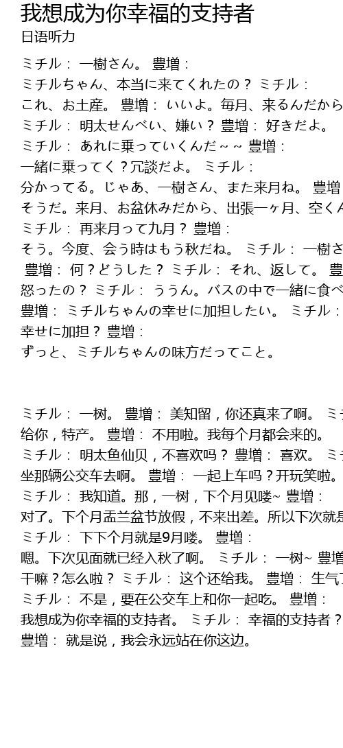 | ミチル: 一树。 豊増: 美知留,你还真来了啊。 ミチル: 给你,特产。 豊増: 不用啦。我每个月都会来的。 ミチル: 明太鱼仙贝,不喜欢吗? 豊増: 喜欢。 ミチル: 坐那辆公交车去啊。 豊増: 一起上车吗?开玩笑啦。 ミチル: 我知道。那,一树,下个月见喽~ 豊増: 对了。下个月盂兰盆节放假,不来出差。所以下次就是下下个月了。 ミチル: 下下个月就是9月喽。 豊増: 嗯。下次见面就已经入秋了啊。 ミチル: 一树~ 豊増: 干嘛?怎么啦? ミチル: 这个还给我。 豊増: 生气了吗? ミチル: 不是,要在公交车上和你一起吃。 豊増: 我想成为你幸福的支持者。 ミチル: 幸福的支持者? 豊増: 就是说,我会永远站在你这边。 |