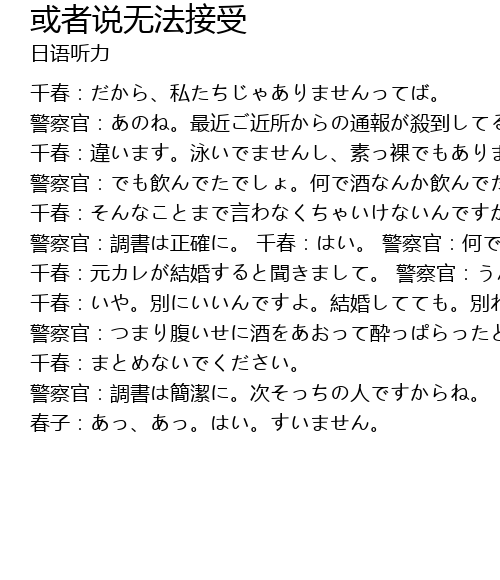 | qian chun: si. jing cha guan:. zui jin jin suo tong bao sha dao. su luo pen shui yong zui. qian chun: wei. yong su luo. jing cha guan: yin. he jiu yin? qian chun: yan? jing cha guan: diao shu zheng que. qian chun:. jing cha guan: he? qian chun: yuan jie hun wen. jing cha guan:. qian chun:. bie. jie hun. bie nian. zhi xian yue he.. na de. jing cha guan: fu jiu zui. qian chun:. jing cha guan: diao shu jian jie. ci ren. chun zi:... |
