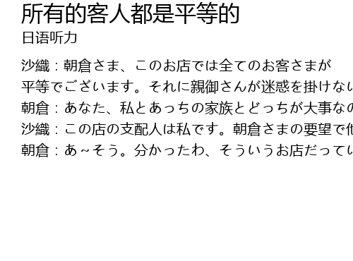 | 沙織:朝倉さま、このお店では全てのお客さまが 平等でございます。それに親御さんが迷惑を掛けないようにちゃんと気を使っていらっしゃるんですから、もう少し暖かい目で見るべきではありませんか? 朝倉:あなた、私とあっちの家族とどっちが大事なの?私の言うこと聞かなかったらどういうことになるか分かってるわよね? 沙織:この店の支配人は私です。朝倉さまの要望で他のお客さまを帰すわけにはまいりません。 朝倉:あ~そう。分かったわ、そういうお店だっていうことね。こんな店すぐにつぶしてやるから。 |