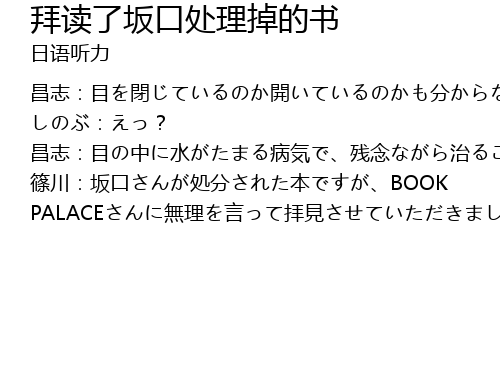 | 昌志:目を閉じているのか開いているのかも分からない。 しのぶ:えっ? 昌志:目の中に水がたまる病気で、残念ながら治ることはないらしい。本を売ろうと思ったのはもう読めなくなったからだ。どうして分かったんだ? 篠川:坂口さんが処分された本ですが、BOOK PALACEさんに無理を言って拝見させていただきました。奥さまにお話を伺ってどうしても気になることがあったので。坂口さんは『月刊日本のお寺』という雑誌を定期購読されてらっしゃいますね? |