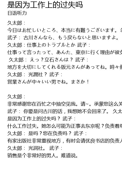 | 久太郎: 非常感谢您在百忙之中抽空见我。请~。承蒙您这么关照我,一直想跟您道谢的。 武子: 你要是问古川的话,我想她不会回来了。 久太郎: 是因为工作上的过失吗? 武子: 什么工作过失。她怎么可能为正事去东京呢?负责着单行本的我,才有可能。 久太郎: 是吗?您在负责吗? 武子: 有家出版社非常重视地方,有时会请优良书店的负责人去东京招待我们,就是叫光润社的出版社。 久太郎: 光润社。 武子: 销售是个非常好的男人。难道说。 |