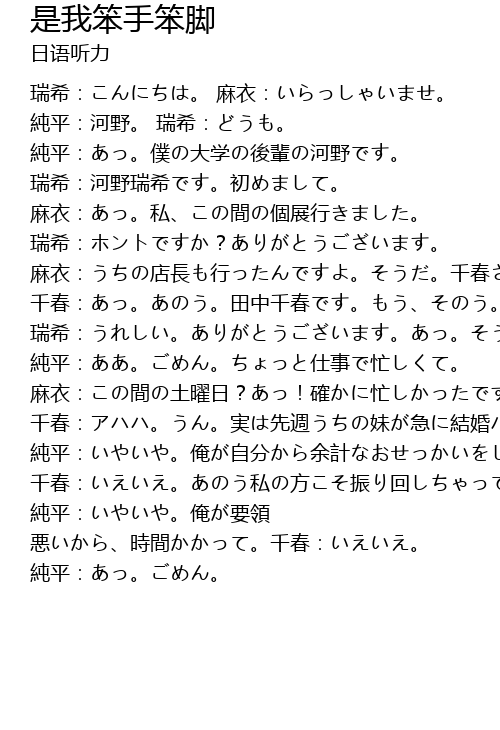 | 瑞希:こんにちは。 麻衣:いらっしゃいませ。 純平:河野。 瑞希:どうも。 純平:あっ。僕の大学の後輩の河野です。 瑞希:河野瑞希です。初めまして。 麻衣:あっ。私、この間の個展行きました。 瑞希:ホントですか?ありがとうございます。 麻衣:うちの店長も行ったんですよ。そうだ。千春さんも確か…。 千春:あっ。あのう。田中千春です。もう、そのう。すごくすてきな絵でした。 瑞希:うれしい。ありがとうございます。あっ。そうだ。先輩。この間の土曜日はどうしたんですか? 純平:ああ。ごめん。ちょっと仕事で忙しくて。 麻衣:この間の土曜日?あっ!確かに忙しかったです。千春さんのパーティーの前日ですもんね。ねえ。千春さん。 千春:アハハ。うん。実は先週うちの妹が急に結婚パーティーをすることになって。それで、あのう、工藤さんに無理を言って、色々お願いしたんです。 純平:いやいや。俺が自分から余計なおせっかいをして。 千春:いえいえ。あのう私の方こそ振り回しちゃって、すいません。 純平:いやいや。俺が要領 悪いから、時間かかって。千春:いえいえ。 純平:あっ。ごめん。 |