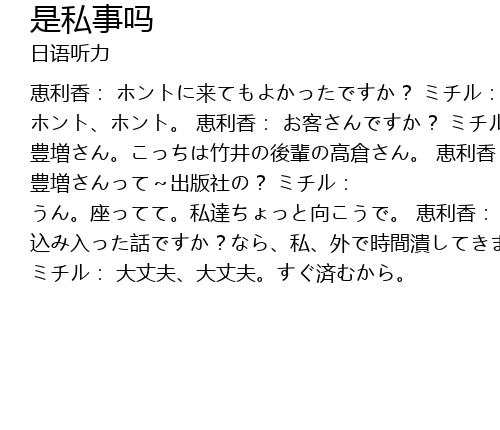 | 恵利香: ホントに来てもよかったですか? ミチル: ホント、ホント。 恵利香: お客さんですか? ミチル: 豊増さん。こっちは竹井の後輩の高倉さん。 恵利香: 豊増さんって~出版社の? ミチル: うん。座ってて。私達ちょっと向こうで。 恵利香: 込み入った話ですか?なら、私、外で時間潰してきます。 ミチル: 大丈夫、大丈夫。すぐ済むから。 |
