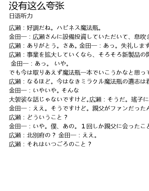 | 広瀬:好調だね。ハピネス魔法瓶。 金田一:広瀬さんに設備投資していただいて、息吹き返せたおかげです。ありがとうございました。 広瀬:ありがとう。さあ。 金田一:あっ。失礼します。 広瀬:事業を拡大していくなら、そろそろ新製品の開発を考えてもいいんじゃないかな? 金田一:あっ。 いや。 でも今は取りあえず魔法瓶一本でいこうかなと思ってます。開発担当のみんなも保温期間を今度2日から3日に延ばそうって気合入ってるんで。 広瀬:なるほど。今はなきミラクル魔法瓶の遺志は君たちに引き継がれたってわけだ。 金田一:いやいや。 そんな 大袈裟な話じゃないですけど。広瀬:そうだ。瑤子に聞いたんだけど、君は広島カープのファンなんだって? 金田一:ええ。そうですけど。親父がファンだったんです。親父の記憶ってそれぐらいしかなくて。 広瀬:どういうこと? 金田一:いや。僕、あの。1回しか親父に会ったことなくて。その最初で最後の1回が球場で初めて生で見た広島戦だったんです。そのときに北別府のサインボールとかもらって。 広瀬:北別府の? 金田一:ええ。 広瀬:それはいつごろのこと? |