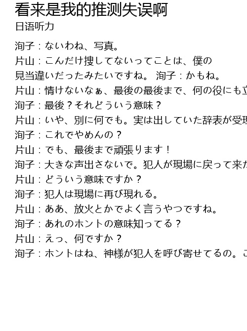 | 見当違いだったみたいですね。 洵子:かもね。 片山:情けないなぁ、最後の最後まで、何の役にも立てないなんて。 洵子:最後?それどういう意味? 片山:いや、別に何でも。実は出していた辞表が受理されて、これが最後の事件になったんです。 洵子:これでやめんの? 片山:でも、最後まで頑張ります! 洵子:大きな声出さないで。犯人が現場に戻って来たら感づかれるでしょ。 片山:どういう意味ですか? 洵子:犯人は現場に再び現れる。 片山:ああ、放火とかでよく言うやつですね。 洵子:あれのホントの意味知ってる? 片山:えっ、何ですか? 洵子:ホントはね、神様が犯人を呼び寄せてるの。これがお前の犯した罪なんだぞって。一生忘れさせないように、見せつけるために。 |