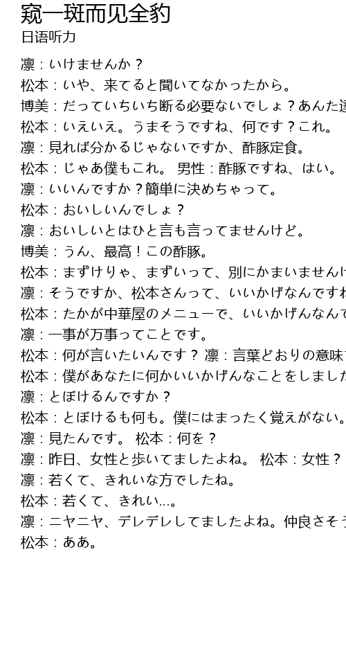| 凛:いけませんか? 松本:いや、来てると聞いてなかったから。 博美:だっていちいち断る必要ないでしょ?あんた達つきあってんだからさ。あれッ、何か私まずいこと言った? 松本:いえいえ。うまそうですね、何です?これ。 凛:見れば分かるじゃないですか、酢豚定食。 松本:じゃあ僕もこれ。 男性:酢豚ですね、はい。 凛:いいんですか?簡単に決めちゃって。 松本:おいしいんでしょ? 凛:おいしいとはひと言も言ってませんけど。 博美:うん、最高!この酢豚。 松本:まずけりゃ、まずいって、別にかまいませんけどね。 凛:そうですか、松本さんって、いいかげなんですね。 松本:たかが中華屋のメニューで、いいかげんなんていわれる覚えがありませんが。 凛:一事が万事ってことです。 松本:何が言いたいんです? 凛:言葉どおりの意味です。 松本:僕があなたに何かいいかげんなことをしましたか? 凛:とぼけるんですか? 松本:とぼけるも何も。僕にはまったく覚えがない。 凛:見たんです。 松本:何を? 凛:昨日、女性と歩いてましたよね。 松本:女性? 凛:若くて、きれいな方でしたね。 松本:若くて、きれい…。 凛:ニヤニヤ、デレデレしてましたよね。仲良さそうに歩いて。 松本:ああ。 |