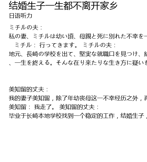| měi zhī liú de zhàng fū: wǒ de qī zǐ měi zhī liú, chú le nián yòu sàng mǔ zhè yī bù xìng jīng lì zhī wài, zài yě méi yǒu jīng lì rèn hé xìng yùn huò zhě zāi nàn. shì gè bù qǐ yǎn de píng fán nǚ zǐ. měi zhī liú: wǒ zǒu le. měi zhī liú de zhàng fū: bì yè yú cháng qí běn dì xué xiào zhǎo dào yí gè wěn dìng de gōng zuò, jié hūn shēng zǐ, yī shēng dōu bù lí kāi jiā xiāng. tā duì yú zhè zhǒng píng fán wú bǐ de shēng huó fāng shì méi yǒu rèn hé yì yì. duì, zhí dào 25 suì de nà gè xià rì. |