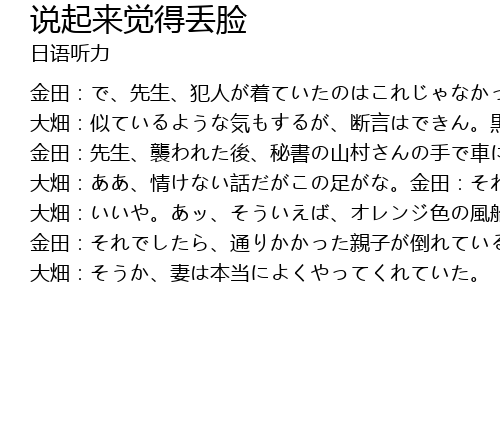 | 金田:で、先生、犯人が着ていたのはこれじゃなかったでしょうか。近くの茂みに捨てられていたもんです。 大畑:似ているような気もするが、断言はできん。黒いごくありふれたウインドブレーカーだったと思う。 金田:先生、襲われた後、秘書の山村さんの手で車に運ばれた。その後ずっと車に? 大畑:ああ、情けない話だがこの足がな。金田:それは当然です。で、その間何か変わったことは? 大畑:いいや。あッ、そういえば、オレンジ色の風船がいくつも上がってくのを窓越しに見たな。何かのイベントだったのか…。 金田:それでしたら、通りかかった親子が倒れている奥様を見つけた時のものでしょう。 大畑:そうか、妻は本当によくやってくれていた。 |