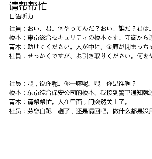 | shè yuán: wèi, shuō nǐ ne. nǐ gàn ma ne. wèi. nǐ shì shuí a? jiǎ běn: dōng jīng zōng hé bǎo ān gōng sī de jiǎ běn. wǒ jiē dào jǐng wèi tōng zhī jiù guò lái le. qīng mù: qǐng bāng bāng máng. rén zài lǐ miàn, mén tū rán guān shàng le. shè yuán: láo nín bái pǎo yī tàng le, hái shì qǐng huí ba. zuò shí mǒ dōu shì méi yòng de. |