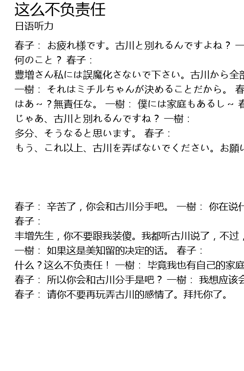 | 春子: 辛苦了,你会和古川分手吧。 一樹: 你在说什么? 春子: 丰增先生,你不要跟我装傻。我都听古川说了,不过,我没有告诉别人,因为我答应了古川。丰增先生,你想把古川怎么样?不如把话挑明吧。 一樹: 如果这是美知留的决定的话。 春子: 什么?这么不负责任! 一樹: 毕竟我也有自己的家庭。 春子: 所以你会和古川分手是吧? 一樹: 我想应该会吧。 春子: 请你不要再玩弄古川的感情了。拜托你了。 |