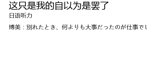 | 博美:別れたとき、何よりも大事だったのが仕事でした。とにかくね、成功したかったのね。うん、そのために、一日24時間自分のために時間を使いたかった。となると、彼には何もしてあげられない。というよりも、負担になってしまう。そもそも、じゃあ結婚する意味はなかったんじゃないのかなって、だんだん、そう考えてる方が重荷になってきましてね。うん、それで、別々の人生を歩いた方がいいんじゃないかなと、思うようになったんです。でも、それは私の独り善がり、自分勝手なエゴでした。あの頃の私はどうしてこう考えられなかったんだろう。苦しみは二人で分けあえば半分になる。喜びは、二人で合わせれば倍になる。それこそが、一緒に生きていくことなんだって。 |