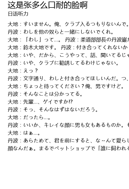 | 大地:すいません。俺、クラブ入るつもりないんで。母ちゃんとの約束で、とっとと家帰って勉強しないと。 丹波:わしを他の奴らと一緒にしないでくれ。 大地:「わし」って…。 丹波:柔道部部長の丹波巌だ。 大地:鈴木大地です。 丹波:付き合ってくれないか? 大地:いや、だから、こうやって、話、聞いてるじゃないですか。 丹波:いや、クラブに勧誘してるわけじゃない。 大地:えっ? 丹波:文字通り、わしと付き合ってほしいんだ。つ、つまり…。こっ、交際してほしいんだ。 大地:ちょっと待ってください?俺、男ですけど。 丹波:そんなことは分かってる。 大地:先輩…、ゲイですか!? 丹波:そっ、そんなはずはないだろう。 大地:だったら…。 丹波:いいか、キレイな顔に男も女もあるものか。もっと自信を持て。 大地:はぁ…。 丹波:あらためて、君を前にすると、な~んて愛らしい 顔なんだぁ。まるでペットショップで「誰に飼われるのか」と不安と希望でうち震えている、真っ白な子犬のようじゃないか! |