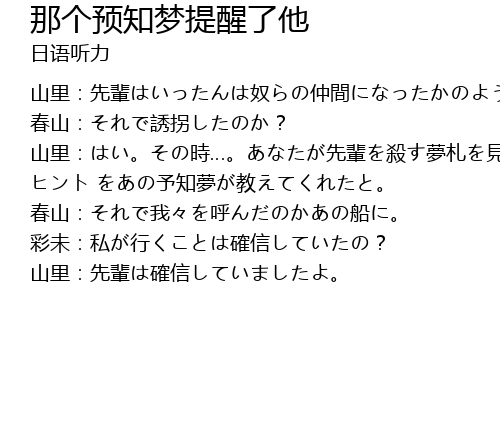| 山里:先輩はいったんは奴らの仲間になったかのように見せかけて、あの子を守り切ろうとしたんです。 春山:それで誘拐したのか? 山里:はい。その時…。あなたが先輩を殺す夢札を見てしまい。先輩は計画を変えることにしました。警察の目の前で自分が死ねば組織は古藤結衣子を諦めて手を引かざるを得なくなるだろう。その ヒント をあの予知夢が教えてくれたと。 春山:それで我々を呼んだのかあの船に。 彩未:私が行くことは確信していたの? 山里:先輩は確信していましたよ。 |