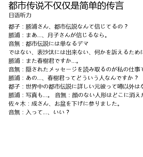 | 都子:勝浦さん、都市伝説なんて信じてるの? 勝浦:まあ…、月子さんが信じるなら。 音無:都市伝説には単なるデマ ではない、表沙汰には出来ない、何かを訴えるために伝えられてきたものがあるんだよ…って、春樹君が言ってた。 勝浦:また春樹君ですか…。 音無:隠されたメッセージを読み取るのが私の仕事です。 勝浦:あの…、春樹君ってどういう人なんですか? 都子:世界中の都市伝説に詳しい元彼って噂以外はなんにも…。会った事もないし、写真も一枚もないし。 勝浦:写真も…。 音無:顔のない人形はどこに消えた? 佐々木:成さん、お盆を下げに参りました。 音無:入って…、いい? |