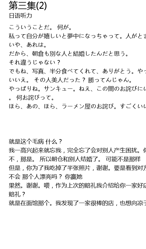 | 就是这个毛病 什么? 我一高兴起来就忘我,完全忘了会对别人产生困扰。你不是也说过吗,我感觉不到别人的心情和状况。 不,那是。 所以朝仓和别人结婚了。 可能不是那样 但是,你为了我吃掉了半张照片,谢谢。要是看到对方那个女人的脸,我一定会受打击 不会 那个人漂亮吗? 你赢她 果然。谢谢。喂,作为上次的赔礼我介绍给你一家好店 赔礼? 就是在面馆那个。我发现了一家很棒的店,也想向凉子道个歉,带凉子一起去嘛。两个人一起去。 |