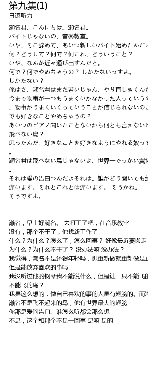 | 濑名,早上好濑名。 去打工了吧,在音乐教室 没有,那个不干了,他找新工作了 什么?为什么?怎么了,怎么回事? 好像最近要搬走 为什么?为什么不干了? 没办法嘛 没办法? 我觉得,濑名不是还很年轻吗,想重新做就重新做是正确的。明白?怎么说好呢,到现在为止做什么都不顺利的人,是不相信事情可以顺利的。 但是能放弃喜欢的事吗 我没听过他的钢琴我不能说什么,但是让一只不能飞的鸟飞不是很残忍吗 不能飞的鸟? 我是这么想的,做自己喜欢的事的人是有翅膀的。而没有翅膀的人,无论多想飞都飞不起来 濑名不是飞不起来的鸟,他有世界最大的翅膀 你那是爱的告白。谁怎么听都会那么想 不是,这个和那个不是一回事 是嘛 是的 |