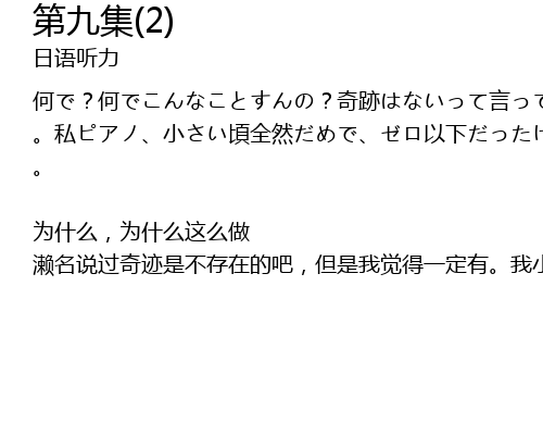 | 为什么,为什么这么做 濑名说过奇迹是不存在的吧,但是我觉得一定有。我小时候钢琴完全不行,一直在0以下,但是一周就到现在这样了。真是奇迹啊。这样的也许说不上是奇迹。我刚来这里的时候,朝仓刚刚失踪的那个时候,这首曲子,濑名为我弹奏的这首曲子救了我。所以我无论如何都想学会这首曲子。不能放弃钢琴,绝对不能舍弃钢琴。如果被濑名舍弃了,这台钢琴怎么办,一定会很悲伤的。 |