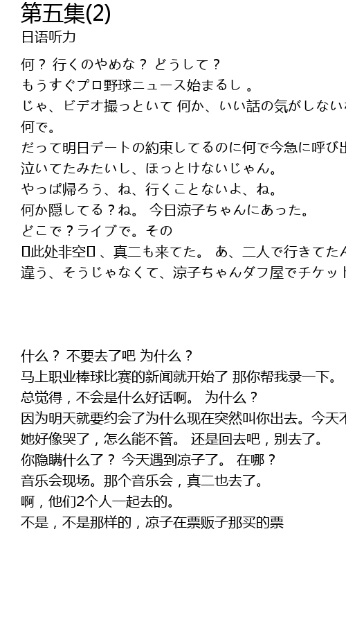 | 什么? 不要去了吧 为什么? 马上职业棒球比赛的新闻就开始了 那你帮我录一下。 总觉得,不会是什么好话啊。 为什么? 因为明天就要约会了为什么现在突然叫你出去。今天不见面比较好吧。 她好像哭了,怎么能不管。 还是回去吧,别去了。 你隐瞒什么了? 今天遇到凉子了。 在哪? 音乐会现场。那个音乐会,真二也去了。 啊,他们2个人一起去的。 不是,不是那样的,凉子在票贩子那买的票 |