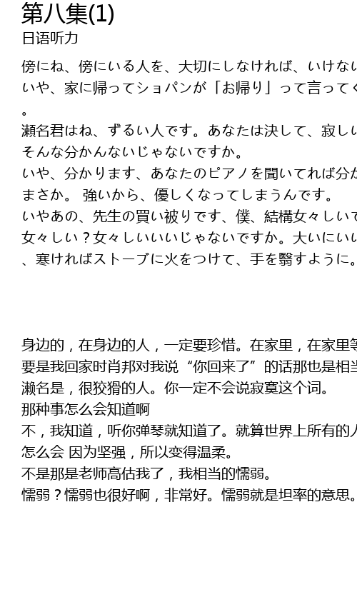 | 身边的,在身边的人,一定要珍惜。在家里,在家里等你的人,一定要珍惜。但是濑名,肖邦是无论你回去多少次都不会对你说“你回来了” 要是我回家时肖邦对我说“你回来了”的话那也是相当恐怖的吧 濑名是,很狡猾的人。你一定不会说寂寞这个词。 那种事怎么会知道啊 不,我知道,听你弹琴就知道了。就算世界上所有的人都说寂寞这样的软话濑名也绝对不会说。你是一个坚强的人。 怎么会 因为坚强,所以变得温柔。 不是那是老师高估我了,我相当的懦弱。 懦弱?懦弱也很好啊,非常好。懦弱就是坦率的意思。濑名,你自己变得更加坦率就行了。就像热的时候打开窗,沐浴夏天的风,冷的时候在火炉里点上火烤烤手。当然,没有不要在大家的面前做,在某个人面前,只要在某个人的面前,就可以了。濑名,把墙突破吧 |