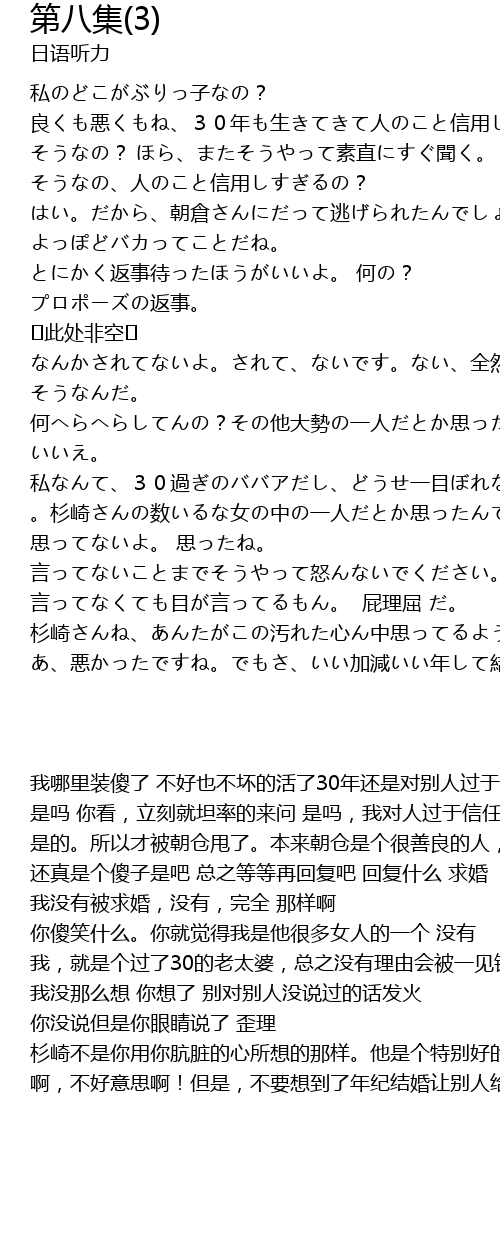 | 我哪里装傻了 不好也不坏的活了30年还是对别人过于信任 是吗 你看,立刻就坦率的来问 是吗,我对人过于信任了吗 是的。所以才被朝仓甩了。本来朝仓是个很善良的人,能被那个人骗你还真是 还真是个傻子是吧 总之等等再回复吧 回复什么 求婚 我没有被求婚,没有,完全 那样啊 你傻笑什么。你就觉得我是他很多女人的一个 没有 我,就是个过了30的老太婆,总之没有理由会被一见钟情。你觉得我只是杉崎很多女人中的一个 我没那么想 你想了 别对别人没说过的话发火 你没说但是你眼睛说了 歪理 杉崎不是你用你肮脏的心所想的那样。他是个特别好的人,不像某些人,他特别成熟,又有经济实力,要结婚的话找杉崎这样的人才好。本来这就是我和杉崎之间的事,我们之间的事和你完全没有关系 啊,不好意思啊!但是,不要想到了年纪结婚让别人给你幸福那种借助外力的事怎么样 |