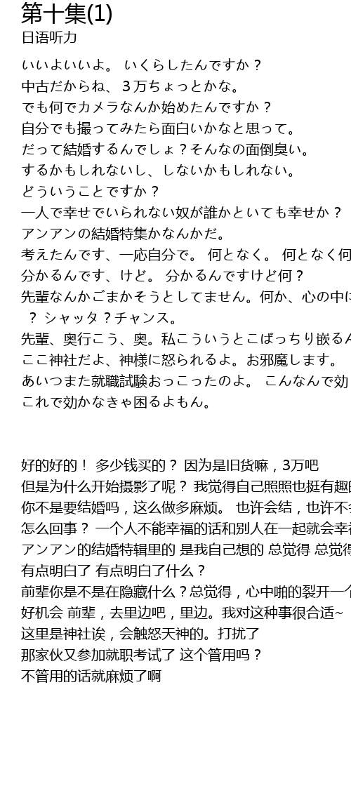 | 好的好的! 多少钱买的? 因为是旧货嘛,3万吧 但是为什么开始摄影了呢? 我觉得自己照照也挺有趣的。 你不是要结婚吗,这么做多麻烦。 也许会结,也许不会结 怎么回事? 一个人不能幸福的话和别人在一起就会幸福吗? アンアン的结婚特辑里的 是我自己想的 总觉得 总觉得什么 有点明白了 有点明白了什么? 前辈你是不是在隐藏什么?总觉得,心中啪的裂开一个大缝,然后为了天上这个缝隙,才开始照相的。 好机会 前辈,去里边吧,里边。我对这种事很合适~ 这里是神社诶,会触怒天神的。打扰了 那家伙又参加就职考试了 这个管用吗? 不管用的话就麻烦了啊 |