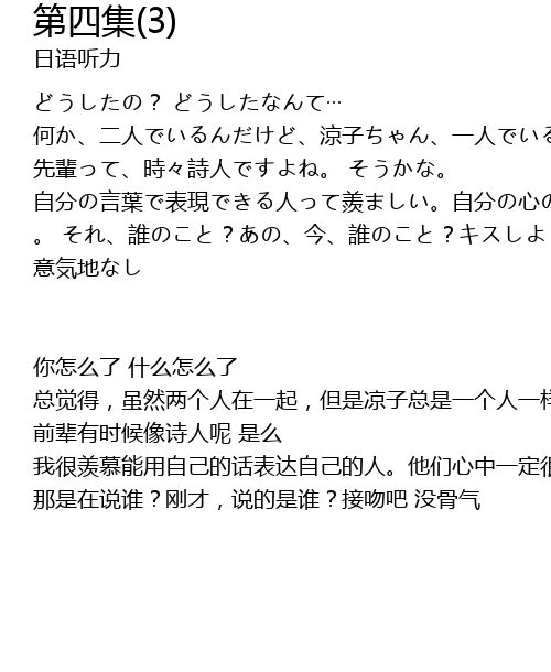 | 你怎么了 什么怎么了 总觉得,虽然两个人在一起,但是凉子总是一个人一样,今天一天都是这种感觉 前辈有时候像诗人呢 是么 我很羡慕能用自己的话表达自己的人。他们心中一定很清楚吧,不会不明白自己的心吧。也有人说话粗鲁,总是随着自己的性子说话,完全不受信赖。但是钢琴可能是为那样的人而存在的。钢琴的声音是真实的,能够表现那个人真正的心情。 那是在说谁?刚才,说的是谁?接吻吧 没骨气 |