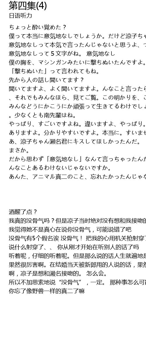 | 酒醒了点? 我真的没骨气吗?但是凉子当时绝对没有想和我接吻的感觉。 我觉得她不是真心在说你没骨气,可能说错了吧 没骨气有5个假名诶 没骨气! 把我的心用机关枪射穿了 说什么射穿了、、 你从刚才开始在听别人的话了吗 听着呢,仔细的听着呢。但是那么说的话人生就遍地是机关枪了。一直在被机关枪打中,一直踩到地雷,即使那样大家,你看,那些光,大家都这样那样的在努力的活着,至少南前辈是这样 果然很厉害啊。在结婚当天被新郎甩的人说的话,果然有说服力,易懂。真的。对不起 啊,凉子是想和濑名接吻的。 怎么会。 所以不加思索地说“没骨气”,一定。 那种事怎么可能。 你忘了像野兽一样的真二了嘛 |