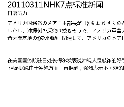 | 在美国国务院驻日处长梅尔发表说冲绳人是敲诈的好手的问题上,昨天美国政府公开道歉,并更换了梅尔处长,日本政府也有计划控制局面的想法。 但是据说由于冲绳方面一直拒绝,强烈表示不可避免的会影响到美军普天间机场迁移问题。相关普天间机场迁移问题,就美国驻日处长梅尔发言说冲绳人是敲诈的好手这一问题上,传言昨天助理国务卿坎贝尔和松本外交部长商谈,更换了驻日处长梅尔。还有驻日大使鲁斯访问冲绳县,对仲井真县长… |