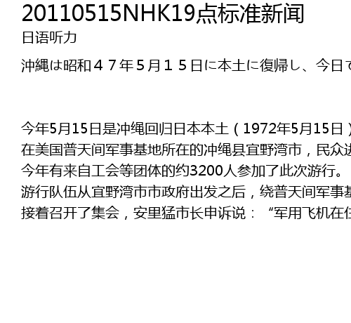 今年5月15日是冲绳回归日本本土(1972年5月15日)39周年的日子。 在美国普天间军事基地所在的冲绳县宜野湾市,民众进行了和平游行,要求拆除密布在县内的美军基地。 今年有来自工会等团体的约3200人参加了此次游行。 游行队伍从宜野湾市市政府出发之后,绕普天间军事基地行进,在基地大门前齐呼“早日还我家园”。 接着召开了集会,安里猛市长申诉说:“军用飞机在住宅上空持续飞过,也不能完全排除噪音污染和飞机坠落的危…