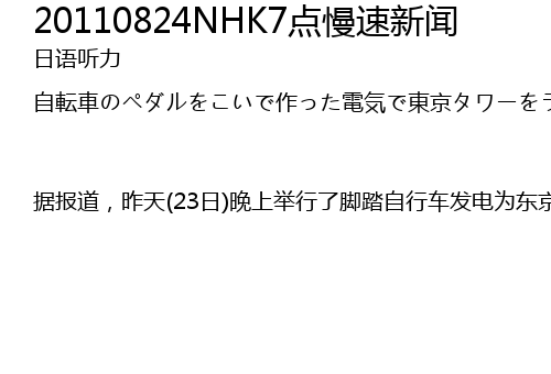 | 据报道,昨天(23日)晚上举行了脚踏自行车发电为东京铁塔点灯的活动。由于核电站事故导致供电不足,东京塔的夜晚点灯时间也比之前缩短了许多。昨天晚上,为了宣传推广“节电”活动,在东京铁塔前的广场上举行了用脚踏自行车发电,为东京铁供电点灯的活动。在东京铁塔前的广场上,准备了10台附带发电机的自行车,共包含体育选手在内的3600人参加了活动。晚上8点多,蓄积了够亮20分钟的电,点亮了放置在地上的9台灯。被点亮的东京铁塔… |