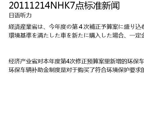 | 经济产业省对本年度第4次修正预算案里新增的环保车辆补助金制度做了进一步的完善,本月下旬购买的环保车也将成为补助对象。 环保车辆补助金制度是对于购买了符合环境保护要求的车辆的消费者发放补助金的制度。从前年4月份实施环保车辆补助金制度至今,1年零5个月间政府共收到450万份补助申请。作为一项刺激国民经济发展的制度,环保车辆补助金制度缓解了环保车销售市场交易量大幅减少的险情。但是,受到日元新高的的影响,汽车产… |