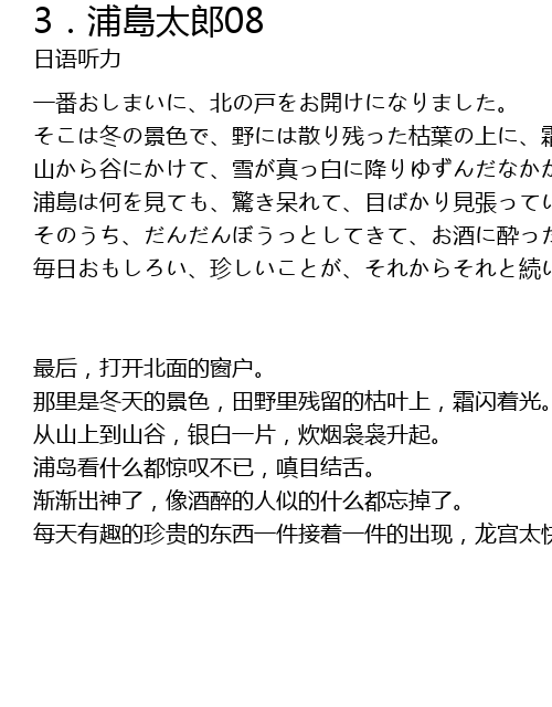 | 最后,打开北面的窗户。 那里是冬天的景色,田野里残留的枯叶上,霜闪着光。 从山上到山谷,银白一片,炊烟袅袅升起。 浦岛看什么都惊叹不已,嗔目结舌。 渐渐出神了,像酒醉的人似的什么都忘掉了。 每天有趣的珍贵的东西一件接着一件的出现,龙宫太快乐了,什么都不想,浑浑噩噩地玩,一晃三年过去了。 |