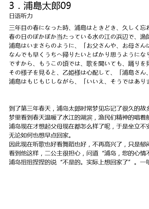 | 到了第三年春天,浦岛太郎时常梦见忘记了很久的故乡。 梦里看到春天温暖了水江的湖滨,渔民们精神的唱着船歌,划着船撒着网等各种情景。 浦岛现在才想起父母现在都怎么样了呢,于是坐立不安了起来。 无论如何也想早点回家。 因此现在听歌也好看舞蹈也好,不再高兴了,只是郁闷。 看到他这样,二公主很担心,问道“浦岛,您的心情不好么”。 浦岛扭扭捏捏的说“不是的。实际上想回家了”。一听到这个二公主突然露出很失望的样子。 |