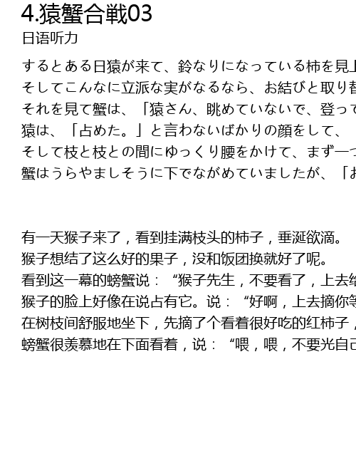| 有一天猴子来了,看到挂满枝头的柿子,垂涎欲滴。 猴子想结了这么好的果子,没和饭团换就好了呢。 看到这一幕的螃蟹说:“猴子先生,不要看了,上去给我摘点怎么样?作为报酬给你一些柿子。” 猴子的脸上好像在说占有它。说:“好啊,上去摘你等着。”一下子就爬到树上了。 在树枝间舒服地坐下,先摘了个看着很好吃的红柿子,特意说:“特别好吃的柿子哇。”狼吞虎咽地吃了起来。 螃蟹很羡慕地在下面看着,说:“喂,喂,不要光自己吃,快点给我这边也仍一点呀。”猴子边说:“好啊,好啊。”边特意扔下青色的柿子。 |