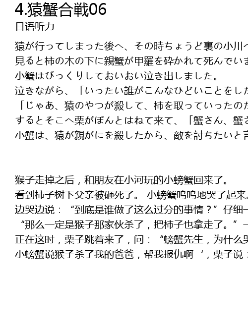 | 猴子走掉之后,和朋友在小河玩的小螃蟹回来了。 看到柿子树下父亲被砸死了。 小螃蟹呜呜地哭了起来。 边哭边说:“到底是谁做了这么过分的事情?”仔细一看,刚刚还很好的柿子树没了,只剩下青青涩涩的柿子。 “那么一定是猴子那家伙杀了,把柿子也拿走了。”一面悔恨,一面又呜呜地哭起来。 正在这时,栗子跳着来了,问:“螃蟹先生,为什么哭啊?” 小螃蟹说猴子杀了我的爸爸,帮我报仇啊‘,栗子说:”过分的猴子。好了,好了,叔叔替你报仇,不哭了。“ |